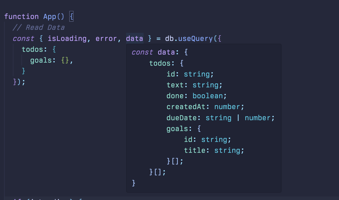const query = { todos: { goals: {}, }, }; const { isLoading, error, data } = db.useQuery(query);
